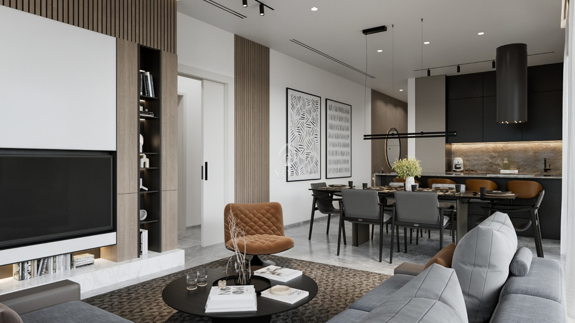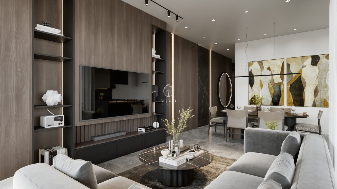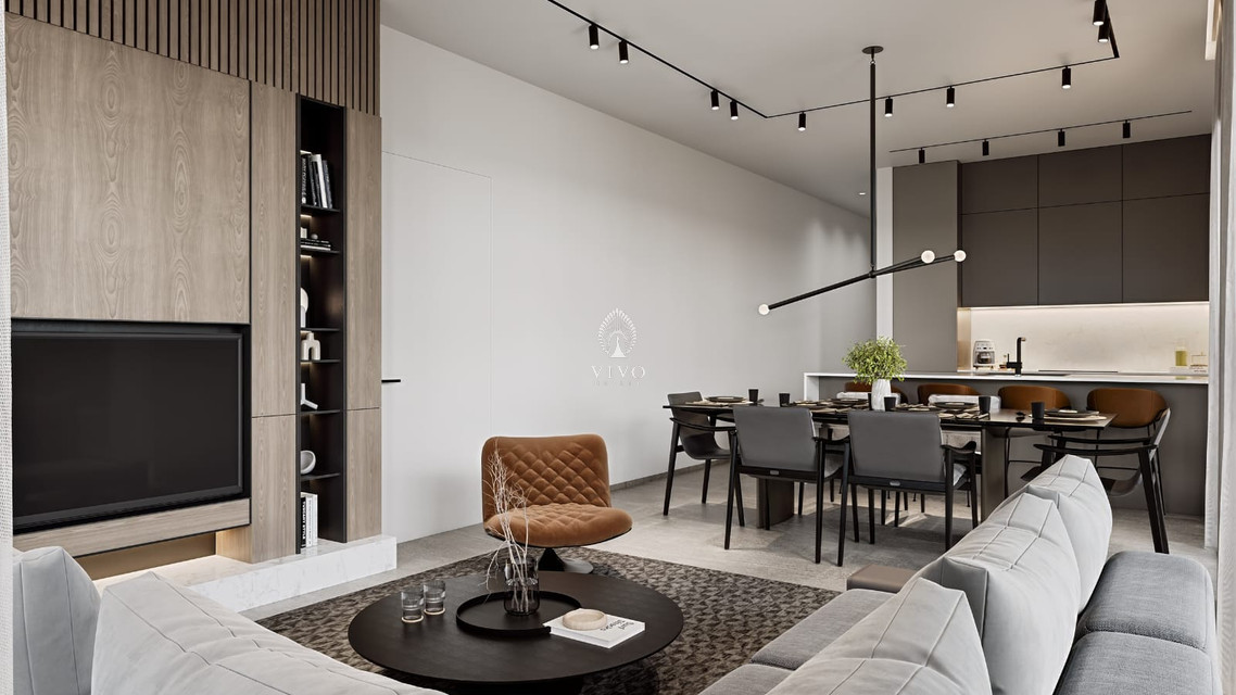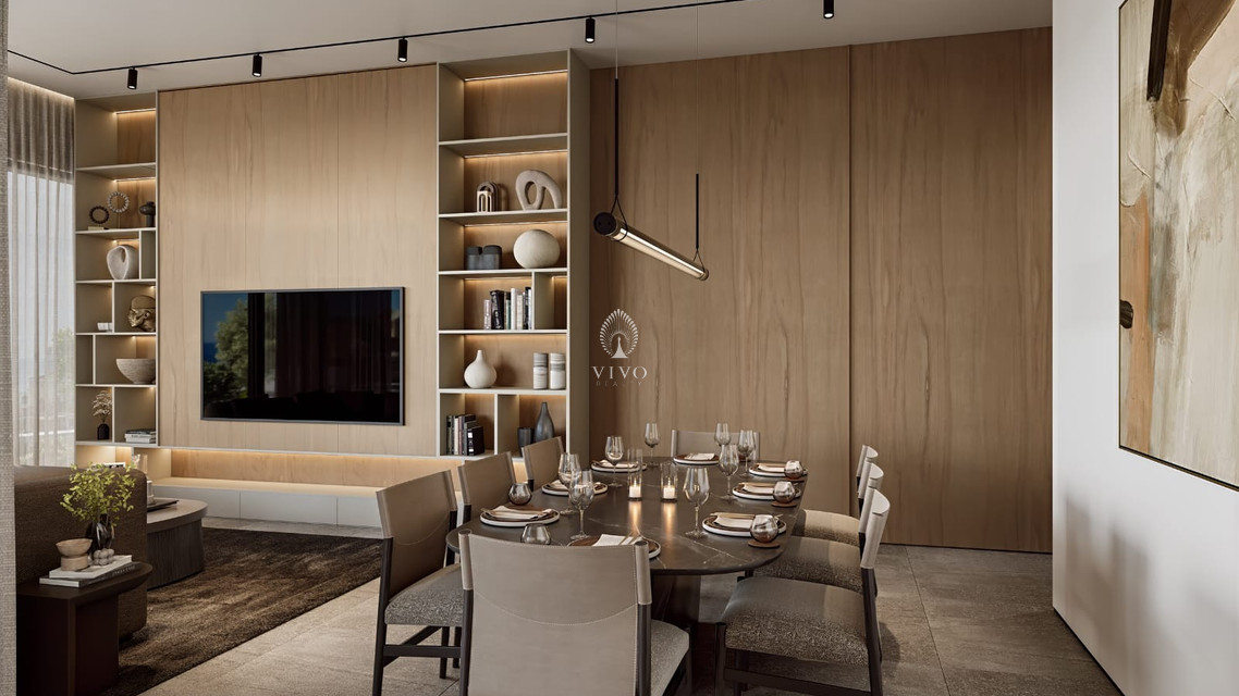 A beautifully curated space with warm wood accents, built-in shelving, and designer lighting. Ideal for entertaining or relaxing in style, it flows naturally to the dining area and modern kitchen.