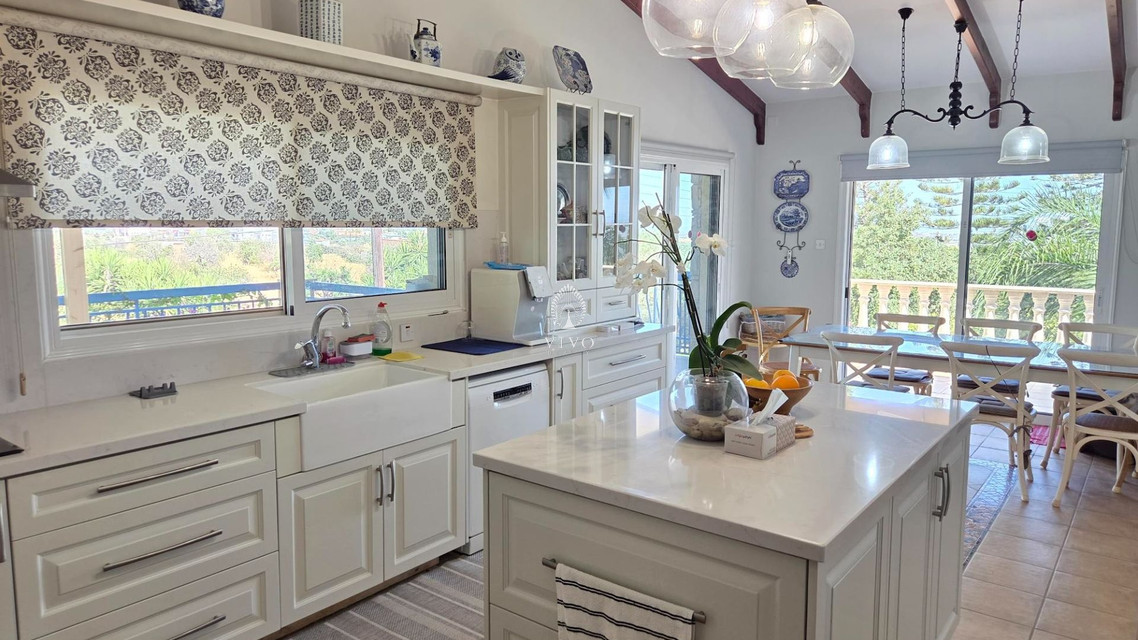 The bright, fully equipped kitchen offers abundant workspace, a central island, and a dedicated dining area with views of the garden—perfect for hosting and everyday convenience.