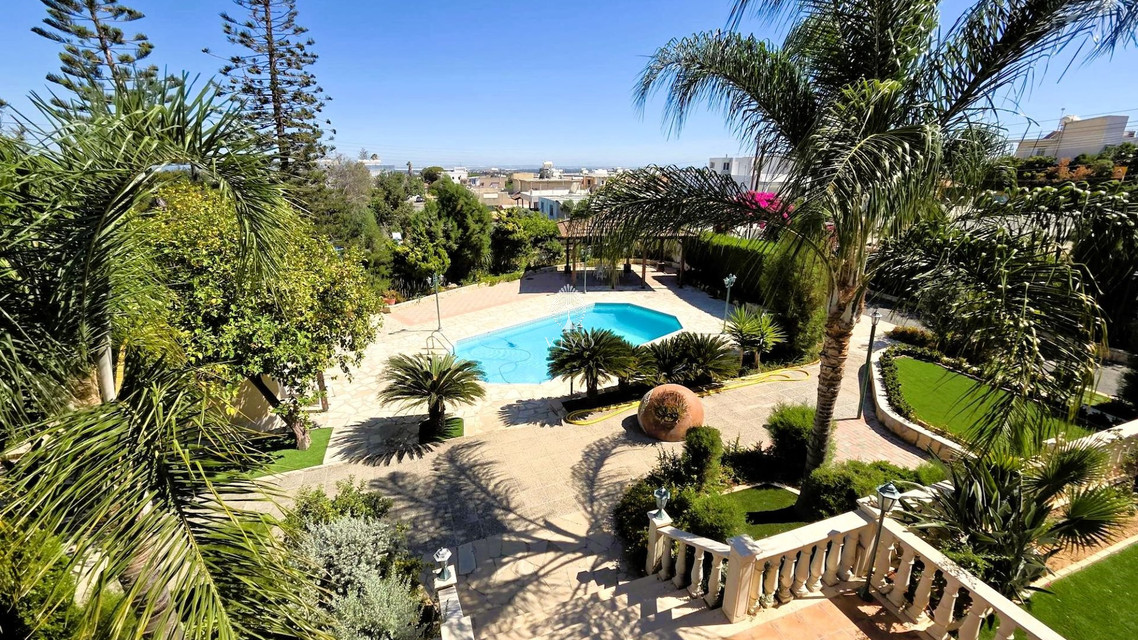 Set within impeccably landscaped grounds, the residence boasts a large private swimming pool surrounded by mature palm trees, manicured lawns, and serene seating areas—creating a resort-like atmosphere for relaxation and entertainment.