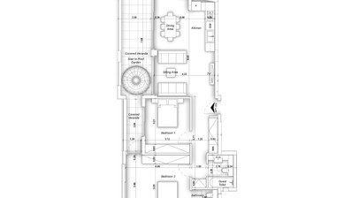 The apartment features an open-plan layout combining the living room, dining area, and contemporary kitchen, creating a bright and welcoming atmosphere with excellent natural light. Large openings connect the living area to a covered veranda, extending the indoor space to a comfortable outdoor lounge area.