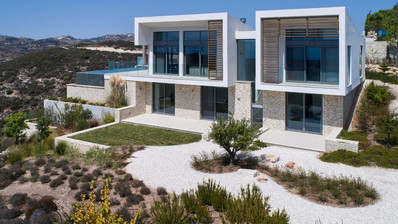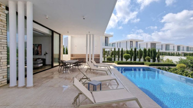 Five bedroom luxury villa with pool, located in Agios Tychonas. Has an infinity edge waterfall swimming pool and has a sundeck with spectacular views and barbeque area. It offers comfort and privacy. Has double glazing windows and height ceilings and allow the panoramic views to be seen by all the terraces.