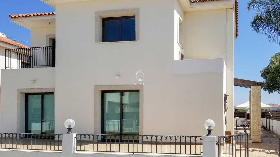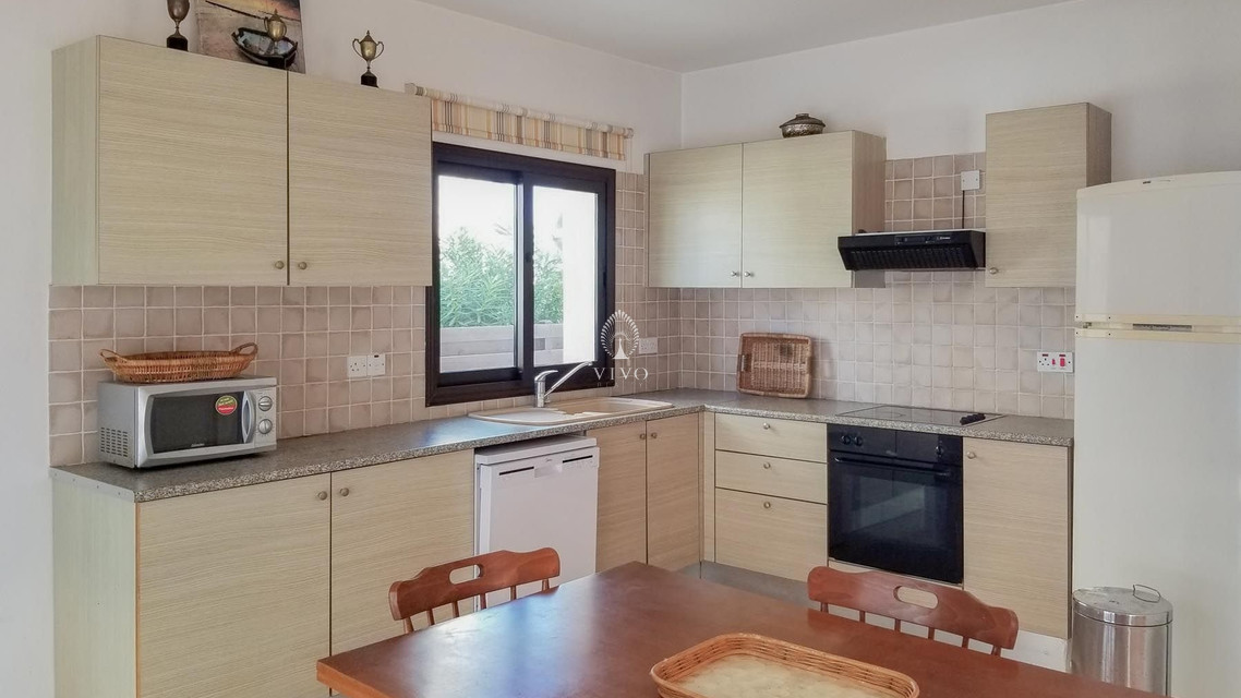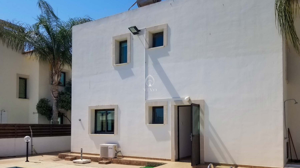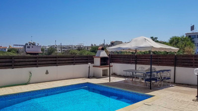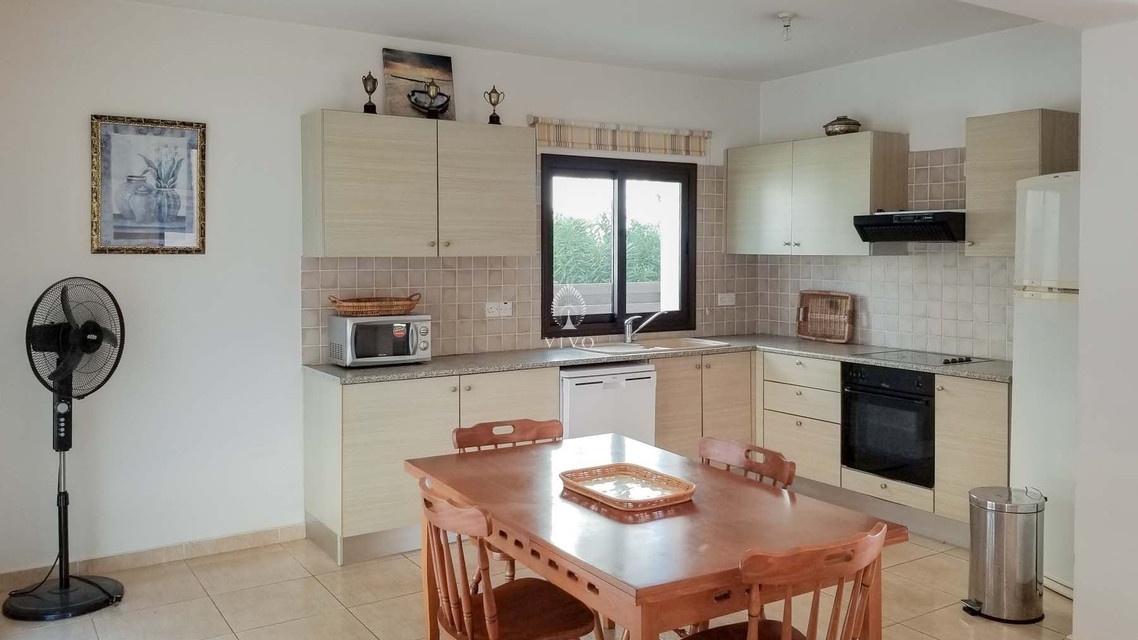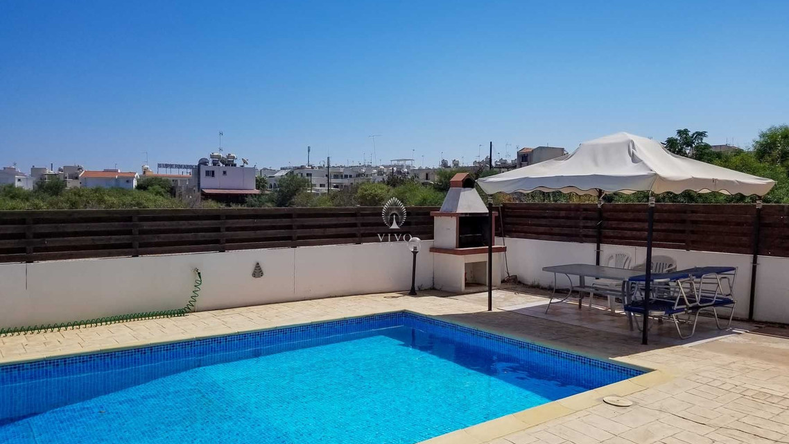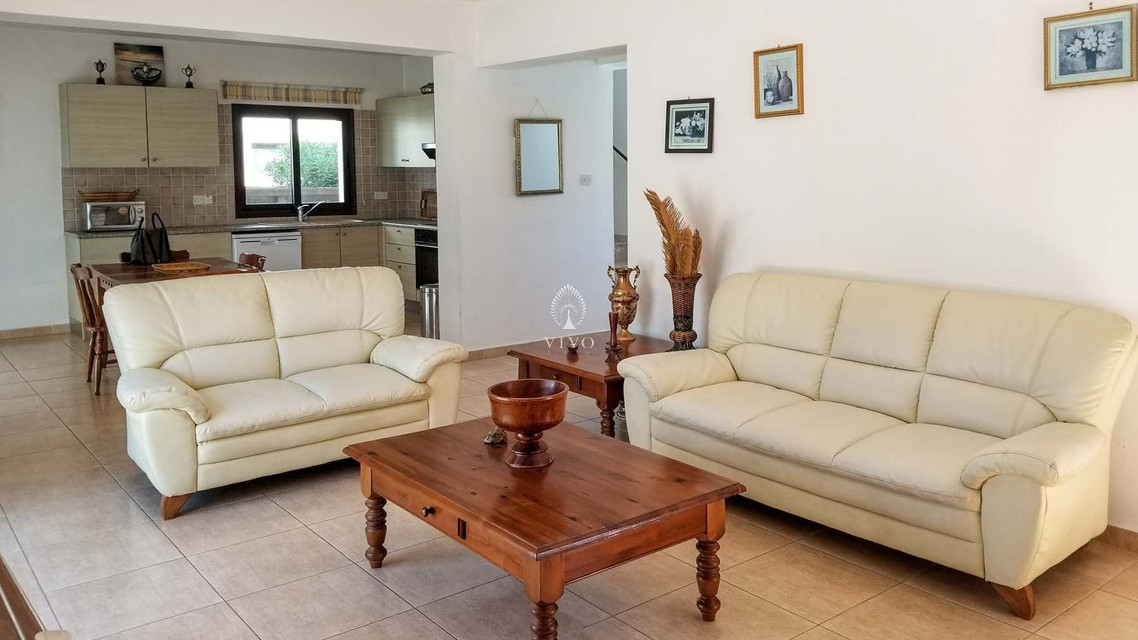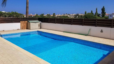 Four bedroom detached house, located near the beach in Kapparis area. Has a private pool and full title deeds! The large downstairs has a spacious living room with dining room and corner kitchen in an open plan layout, with large sliding doors to the front veranda. A back door leads to the sunny pool patio with a gazebo tent and sitting area with shade.