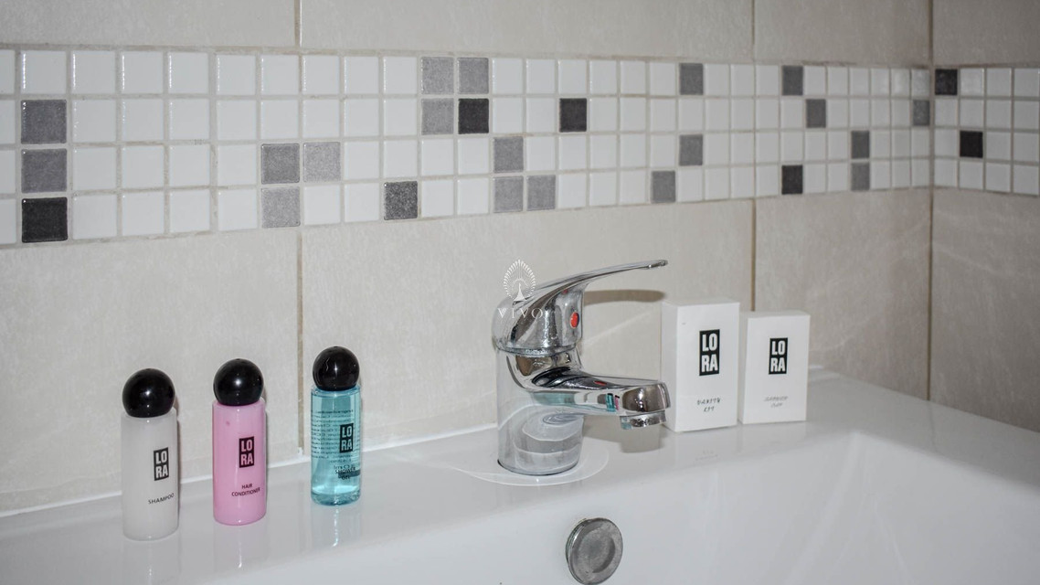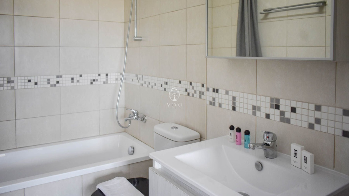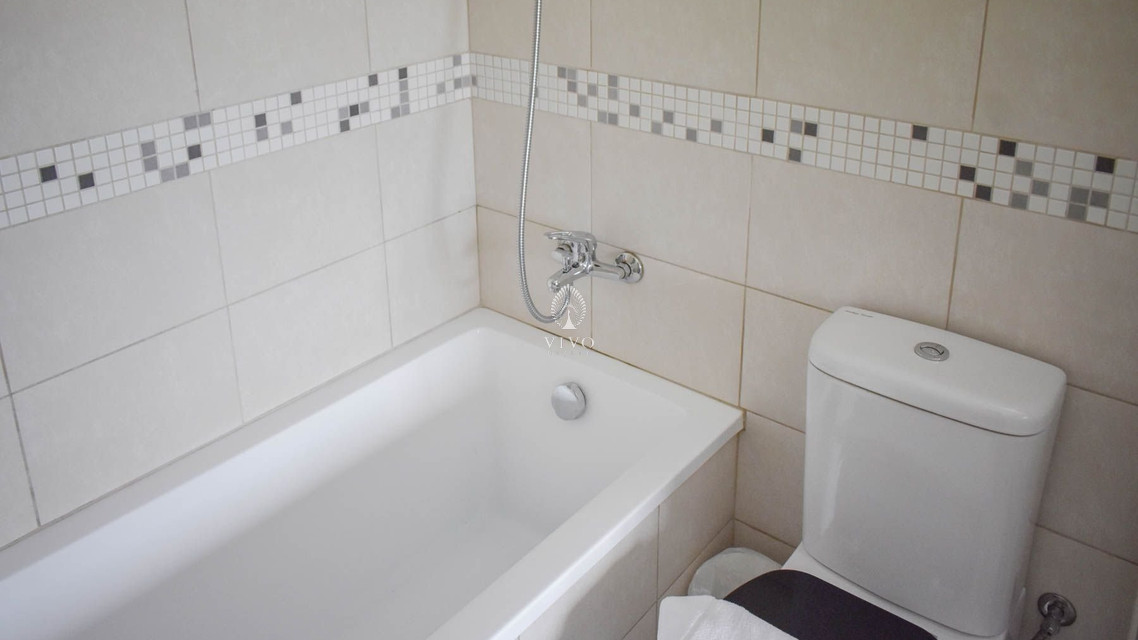 The apartment has two bright bedrooms, one with a large sliding door to the veranda and the second with windows on two sides, each with its own built-in storage. Also find a family bathroom with tile detailing.