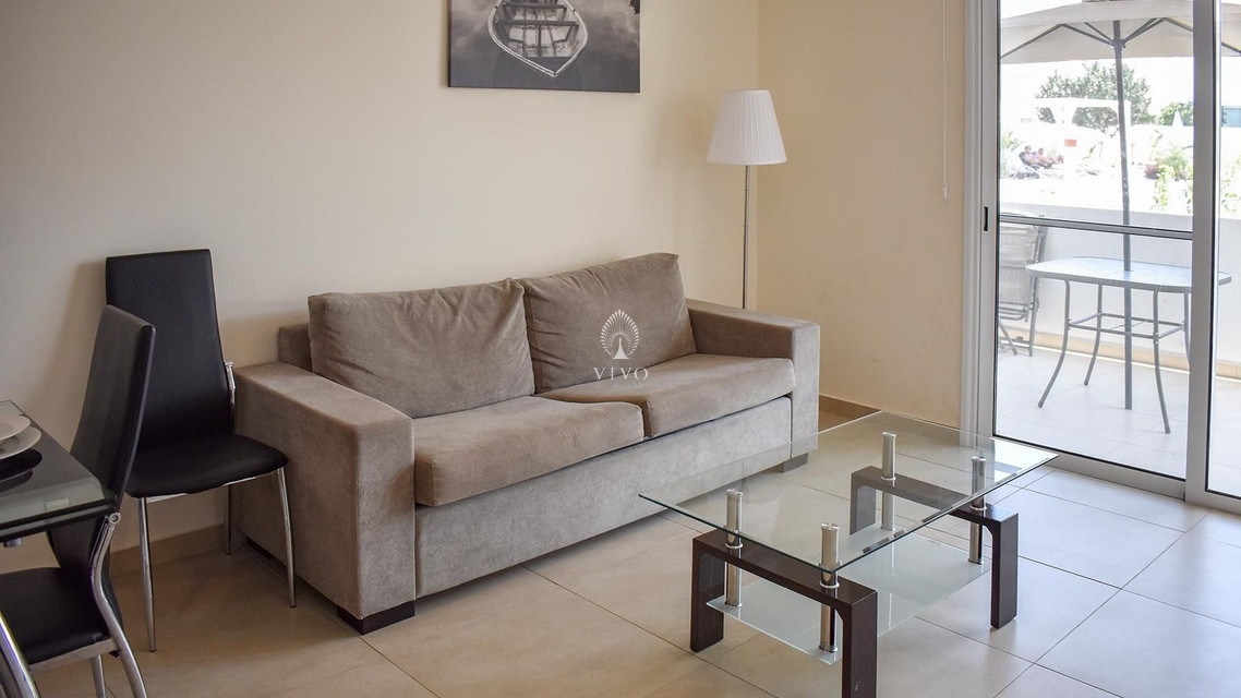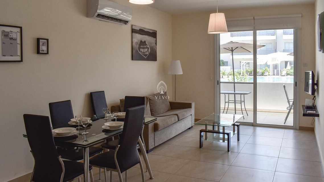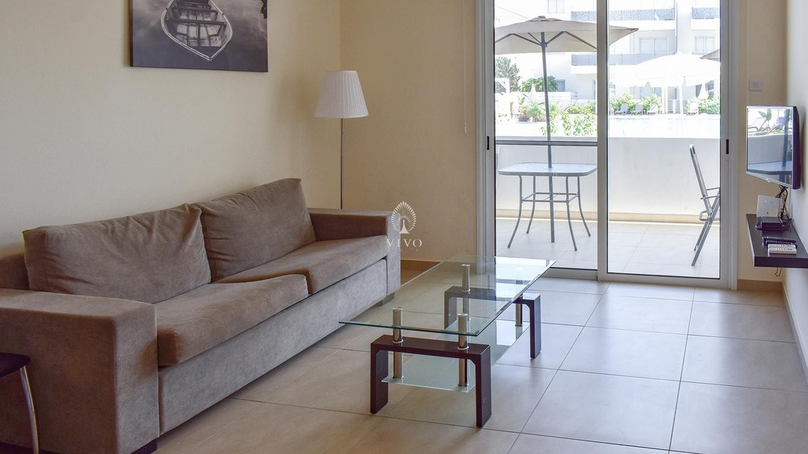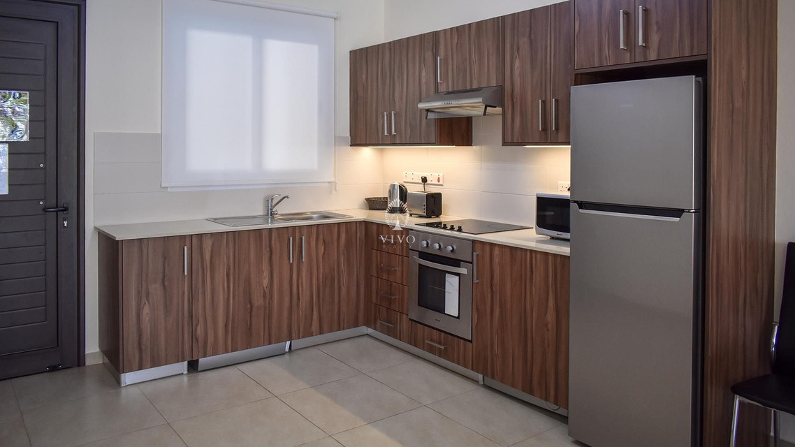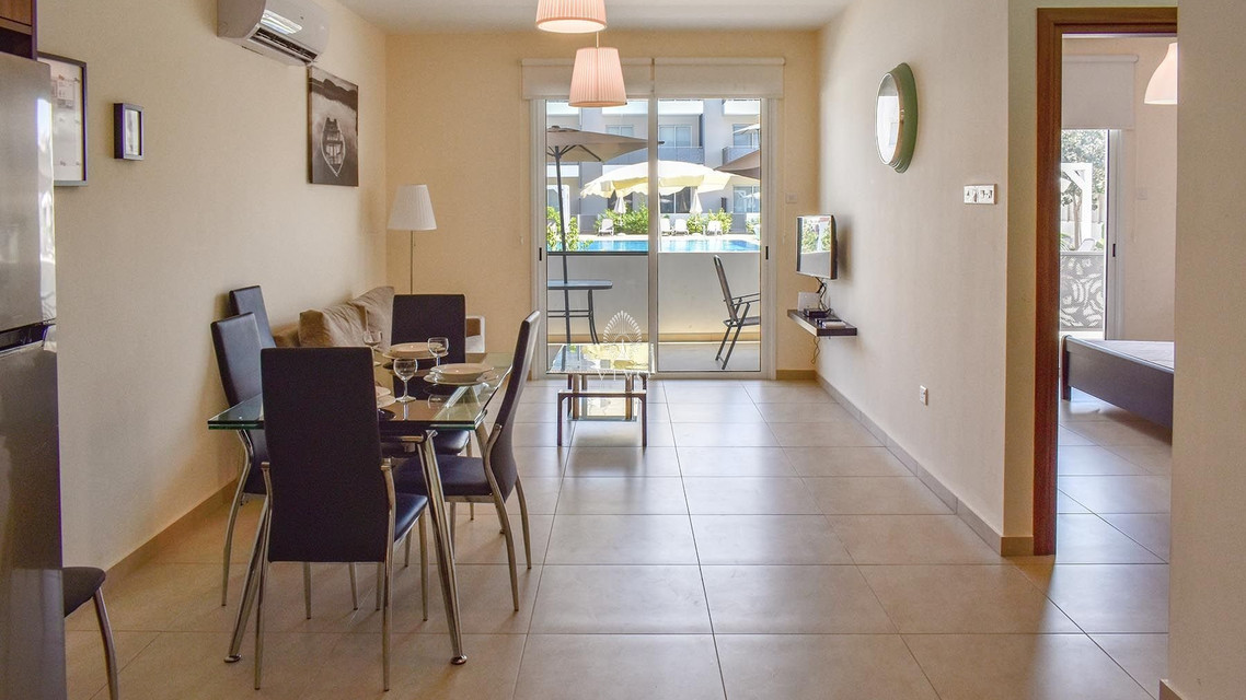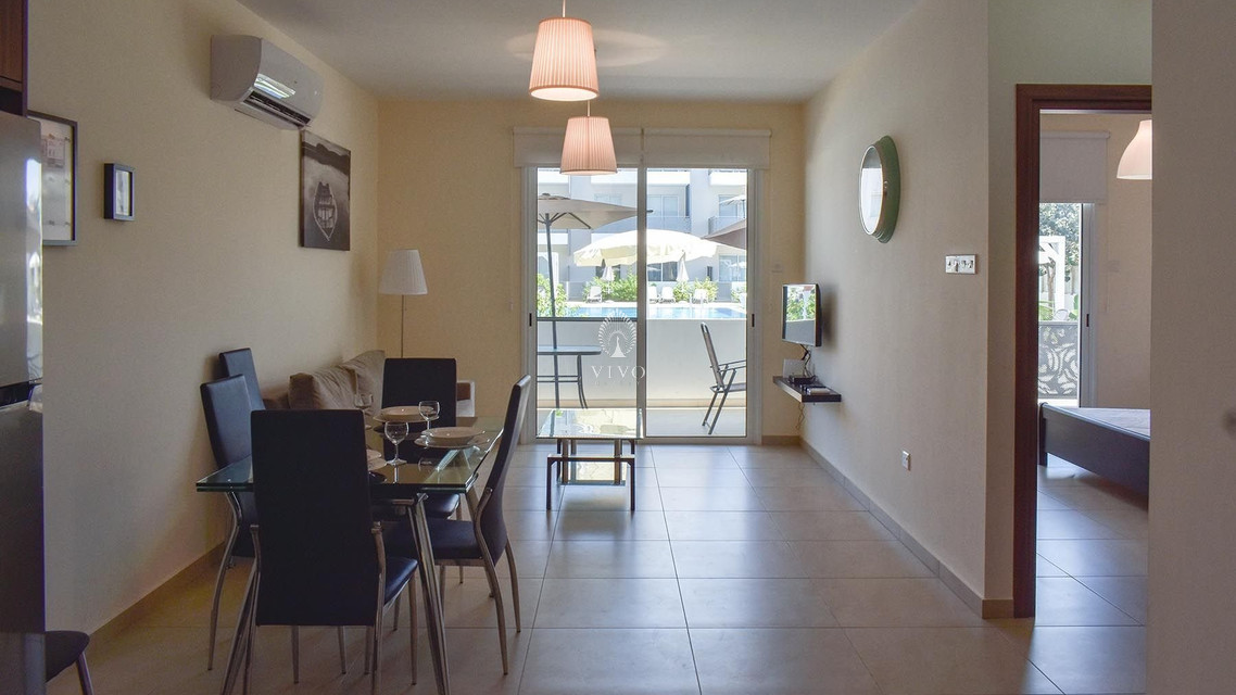 Poolfront 2 bedroom apartment, located in Kapparis area. The apartment has a large, open-plan kitchen, living, and dining room that leads out through double-glazed sliding doors to the covered balcony.