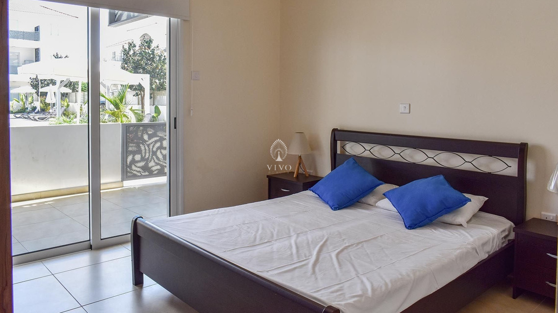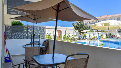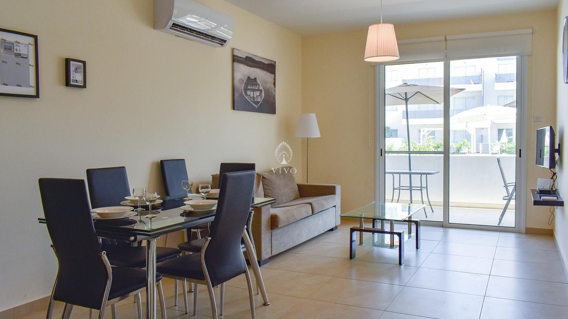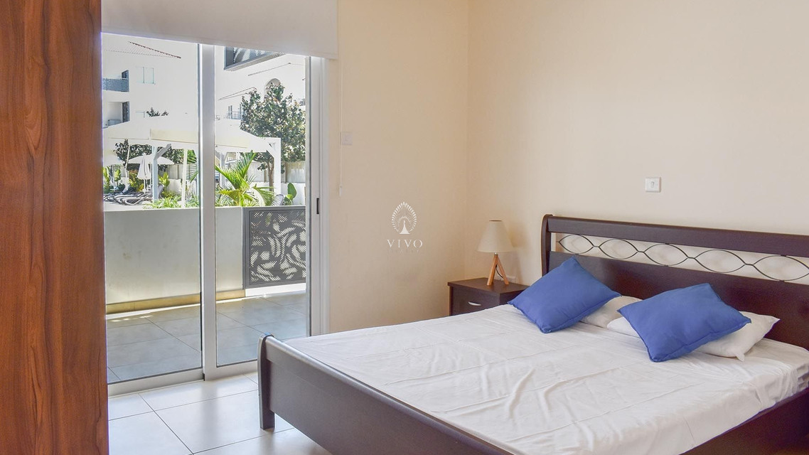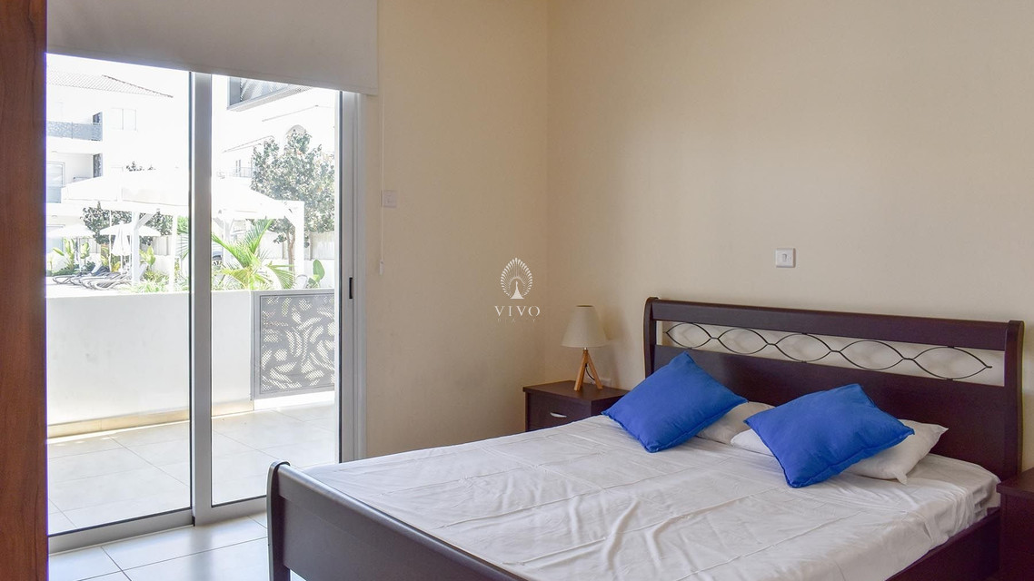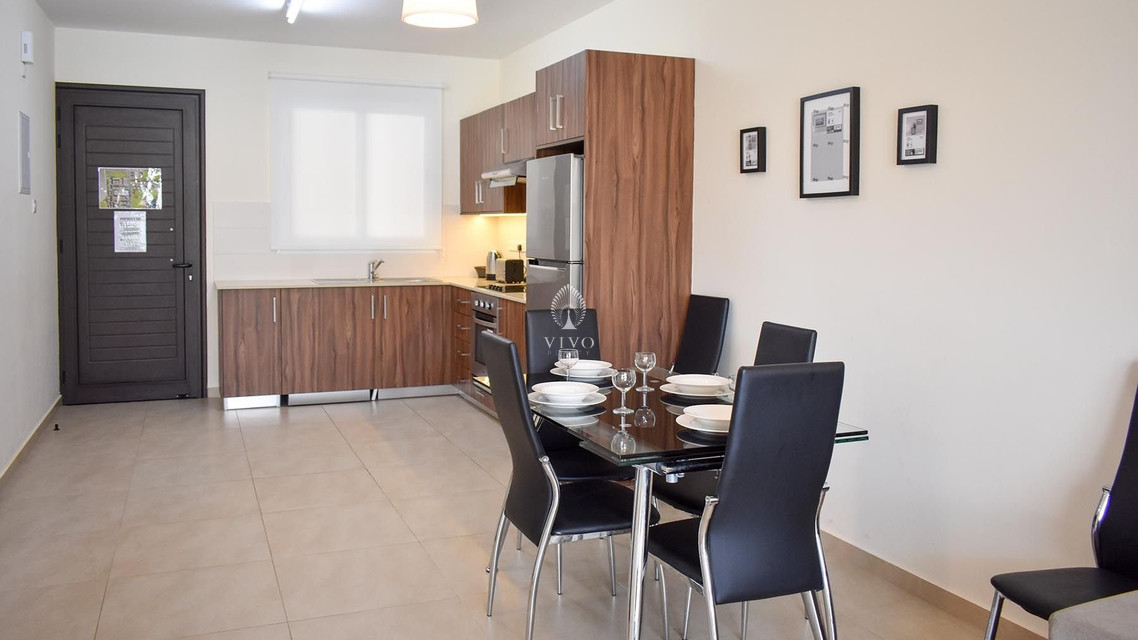 Poolfront 2 bedroom apartment, located in Kapparis area. The apartment has a large, open-plan kitchen, living, and dining room that leads out through double-glazed sliding doors to the covered balcony.