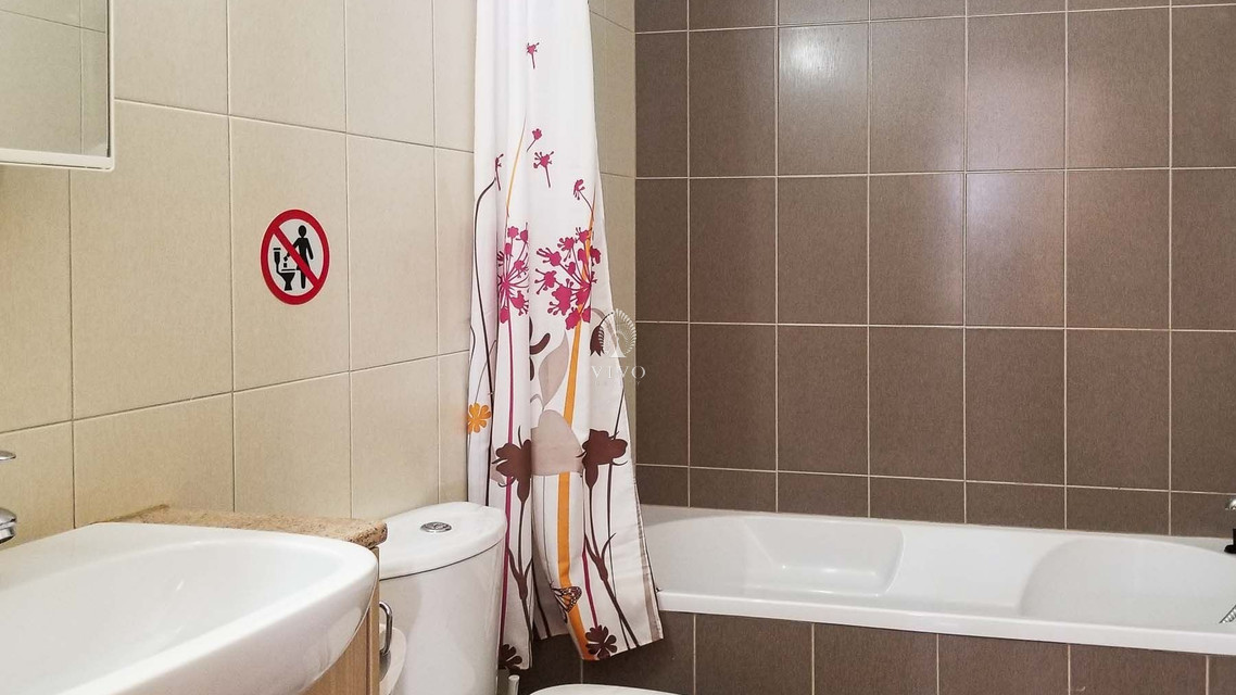 The apartment has two bright bedrooms, one with a large sliding door to the veranda, each with its own built-in storage. Also find a family bathroom with full bath.