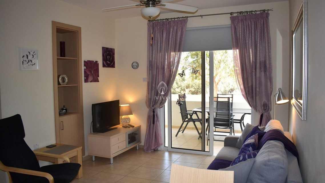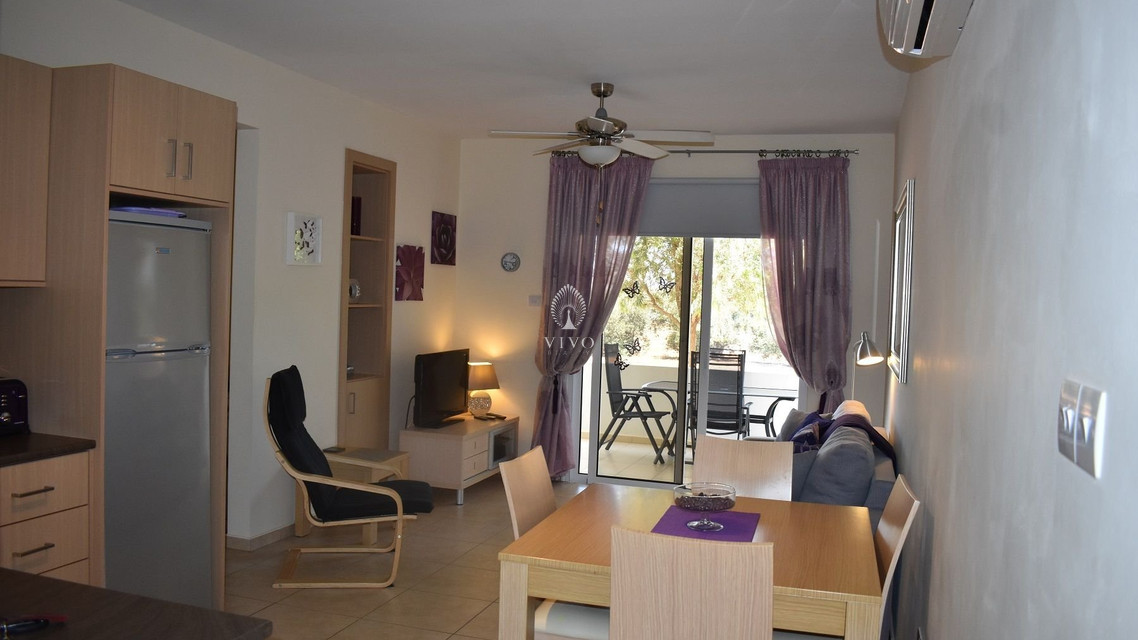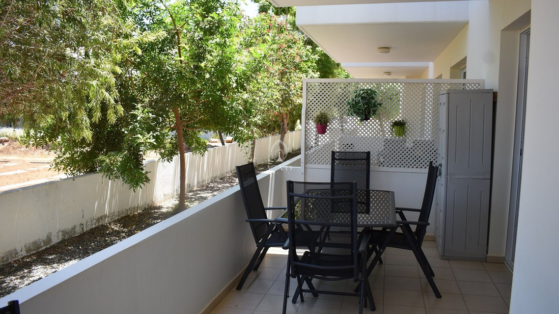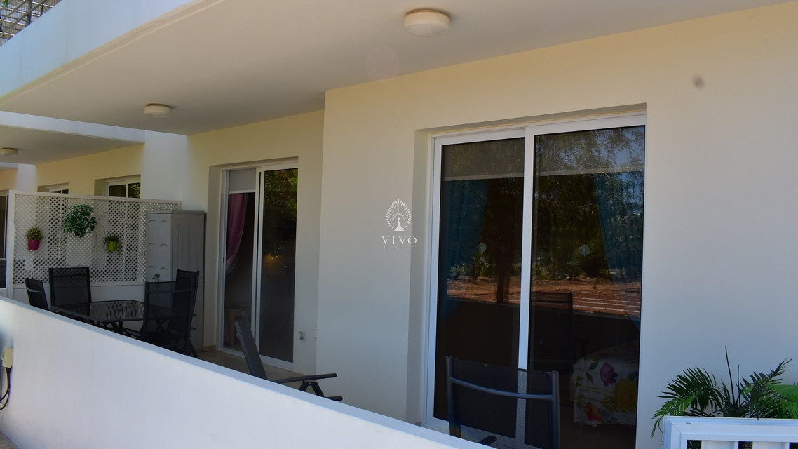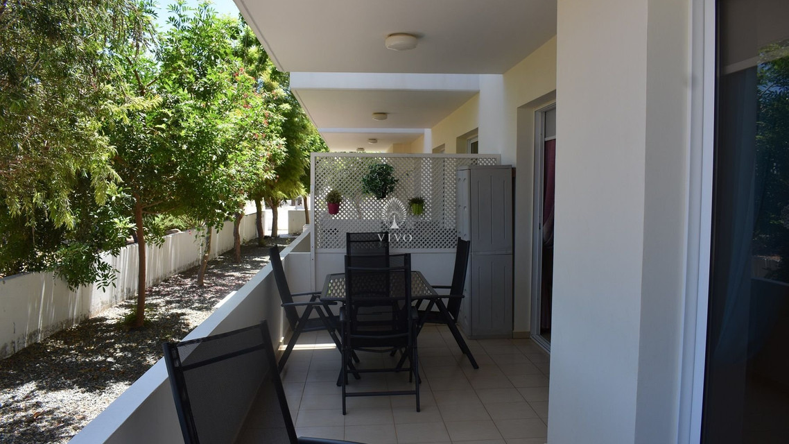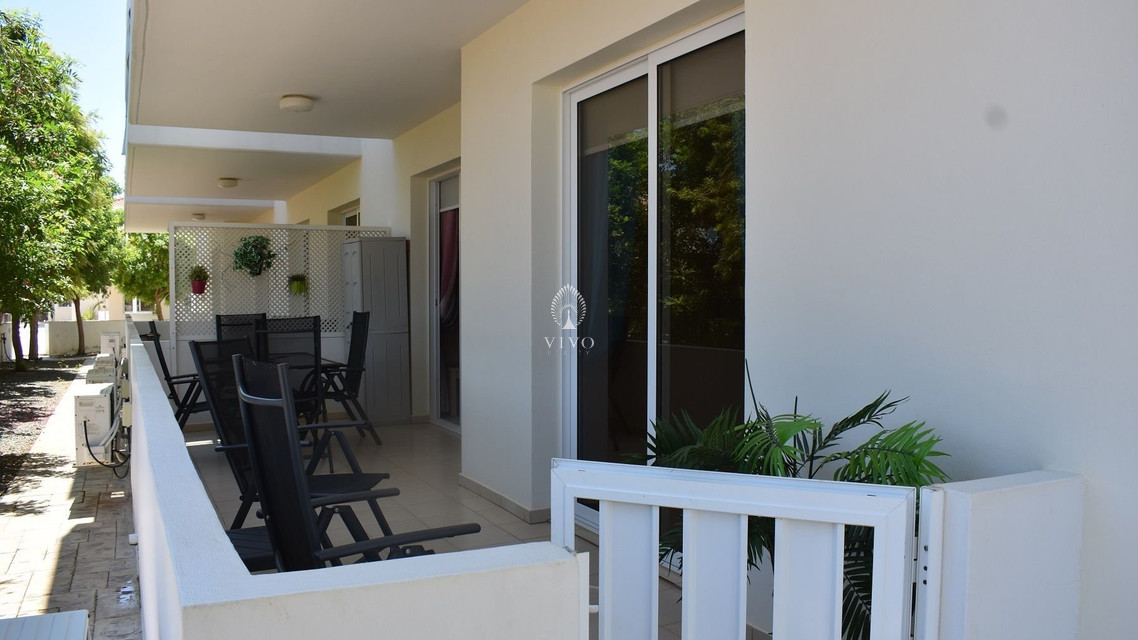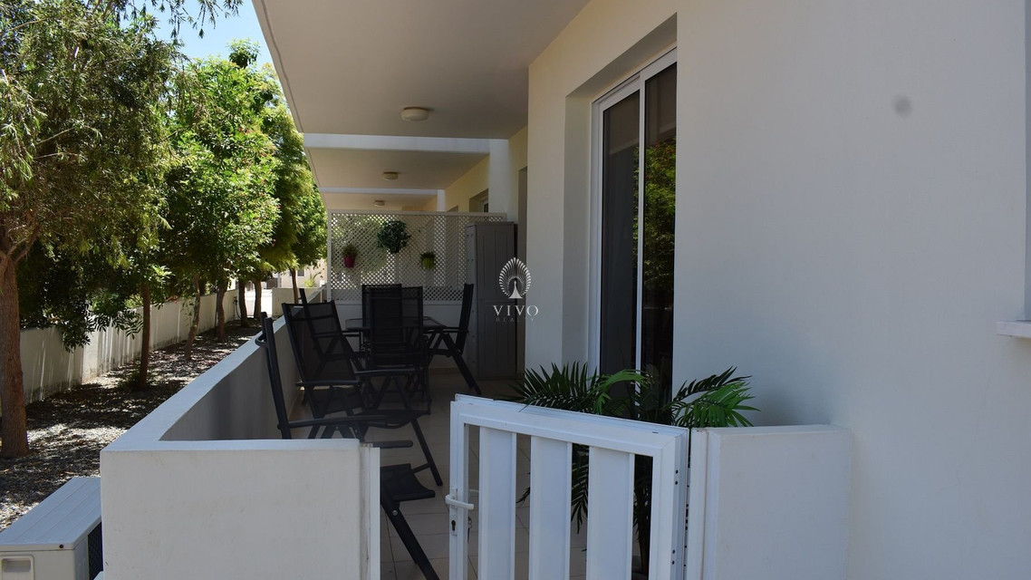 Two bedroom ground floor apartment, located in Kapparis area. Situated in a luxury seaside development this apartment has a large veranda surrounded by a garden and green area. In addition, it has an open plan design with large double glazed doors and 2 bright bedrooms. One of the bedroomshas a large sliding door to the veranda with its own built in storage. Has air condition split units.
