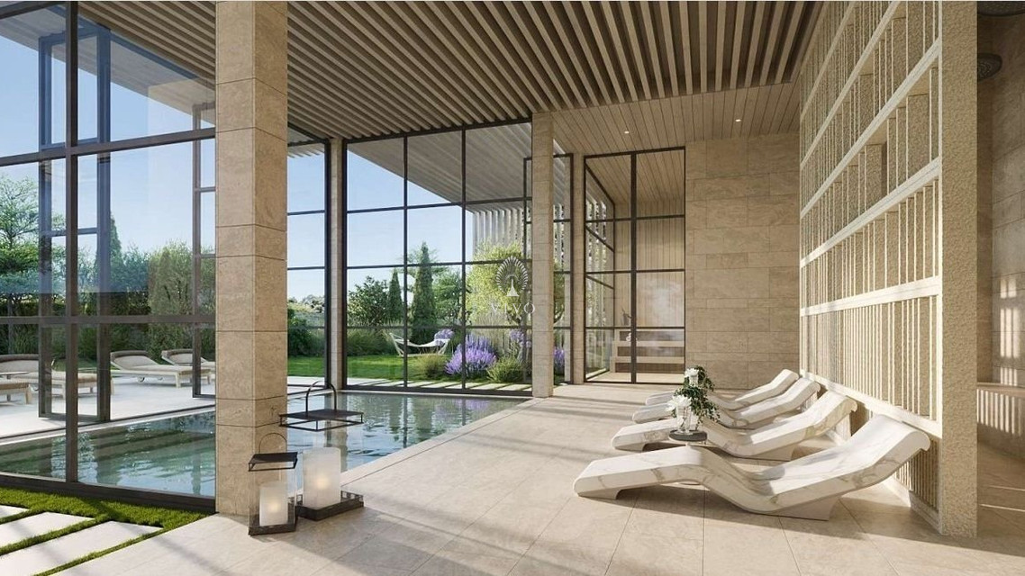 Wellness center with an outdoor swimming pool, a complex for spa treatments, a fitness area, lawns for yoga and meditation