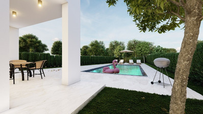 Open plan living, dining & kitchen areas with private swimming pool surrounded with extensive outdoor patio & gardens.
