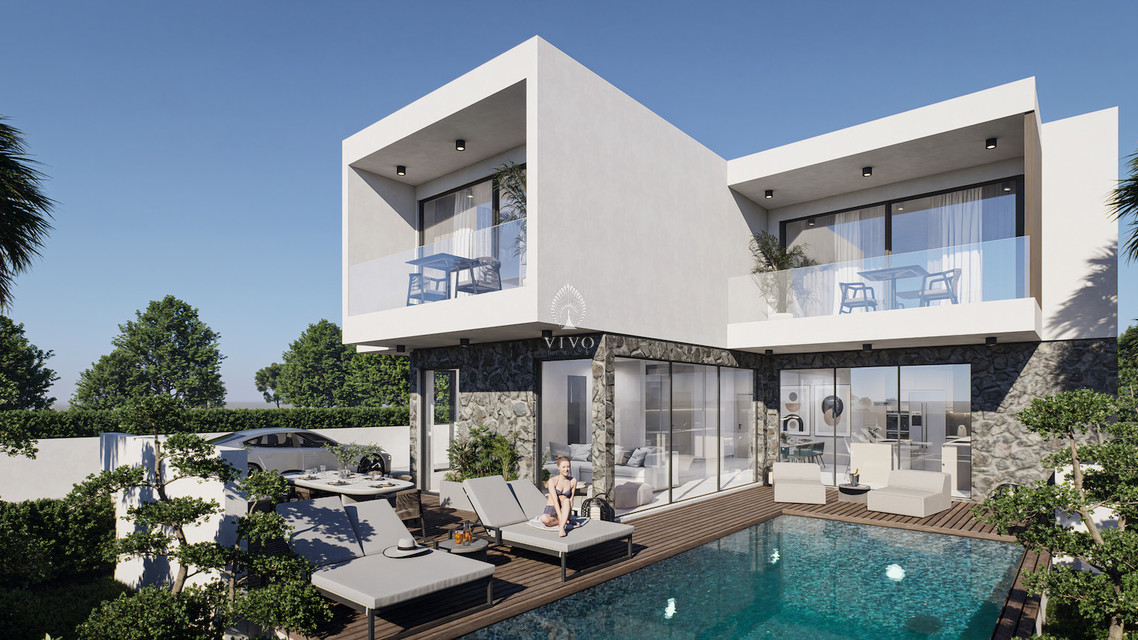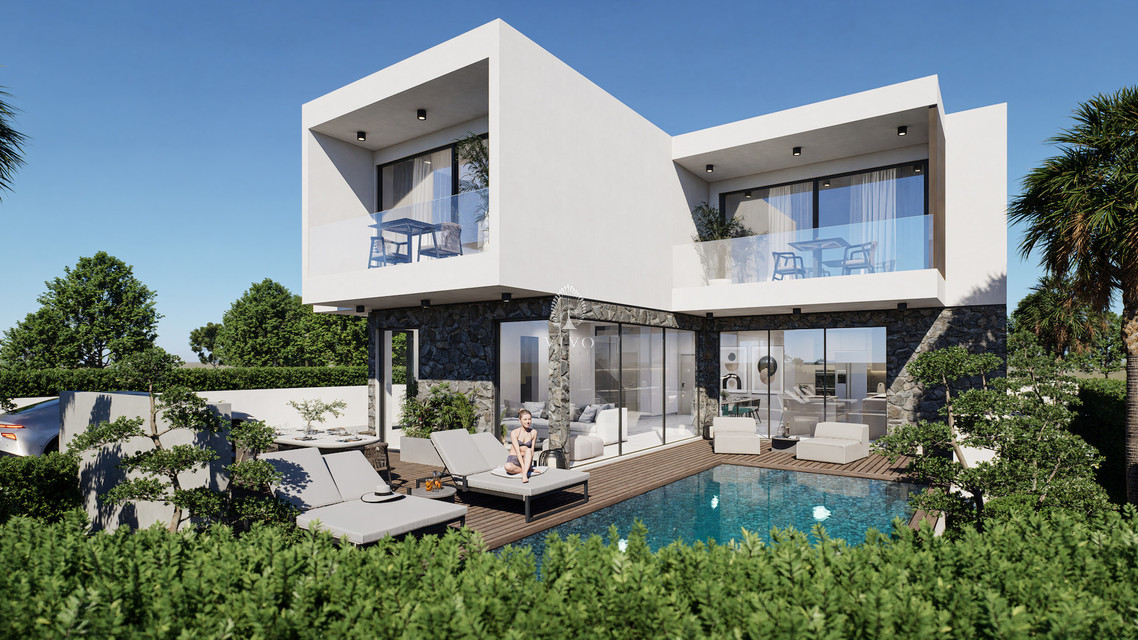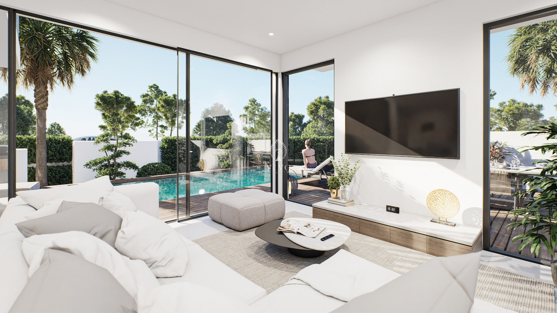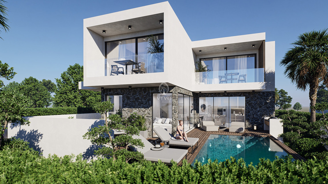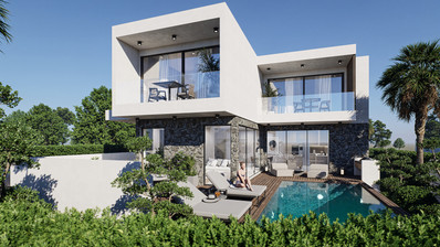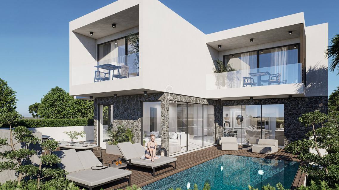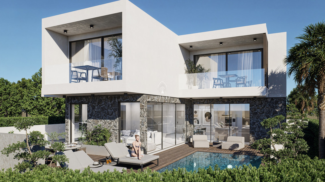 Our modern 4-bedroom and 5-bathroom villa, covering over 237sqm on a 582sqm plot, features open-plan living and luxurious bedrooms with balconies overlooking the sea.