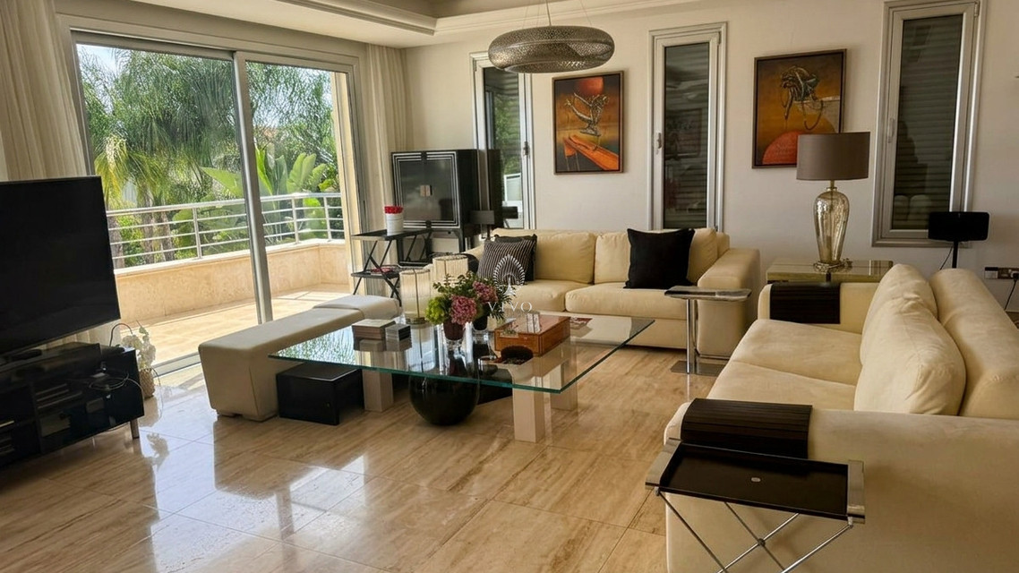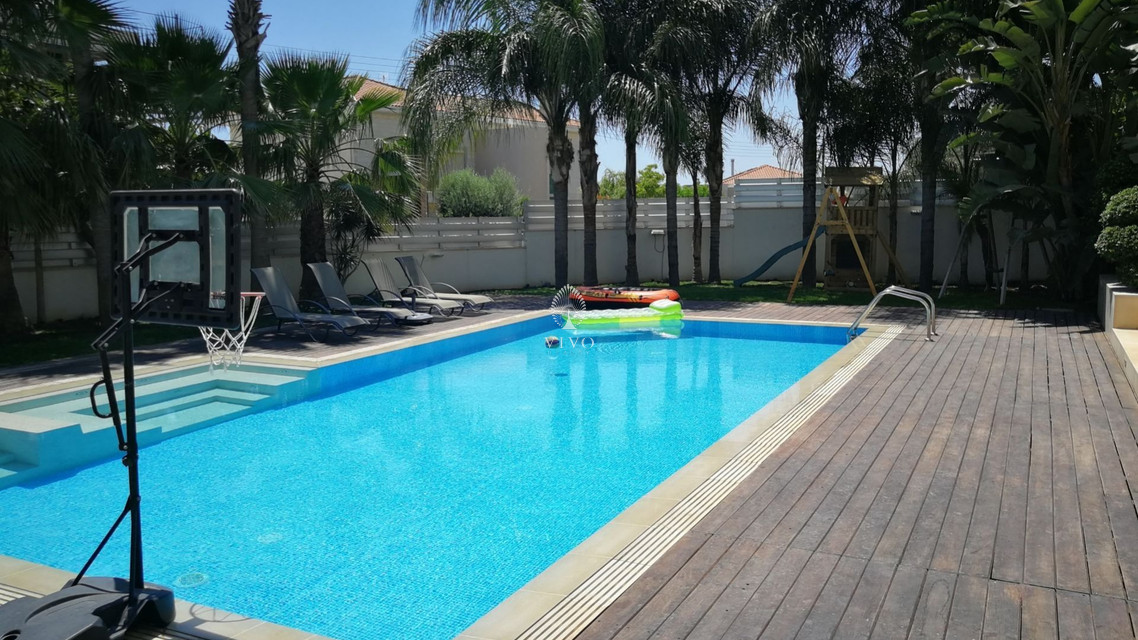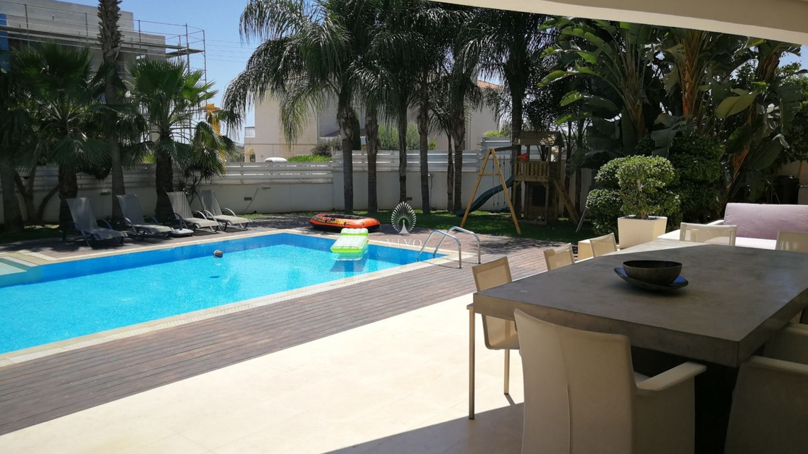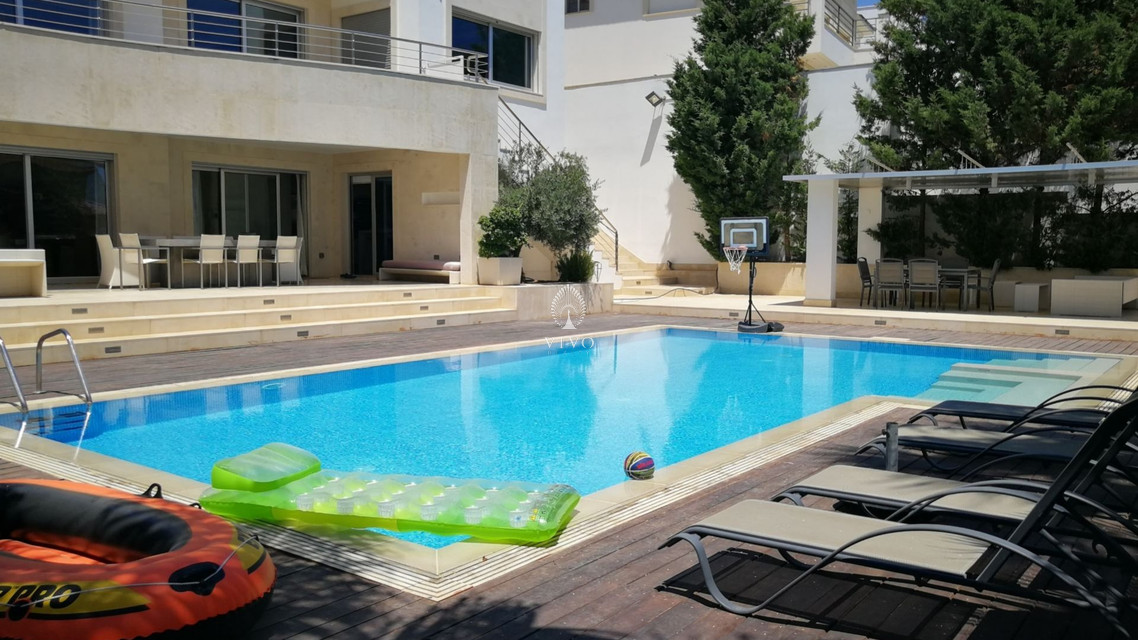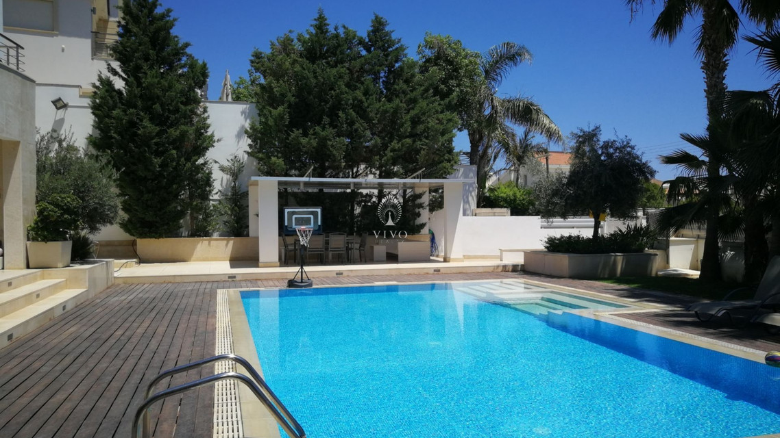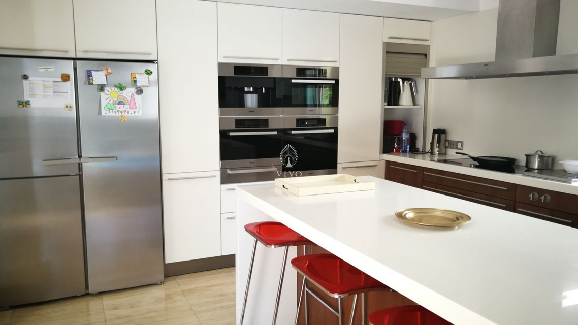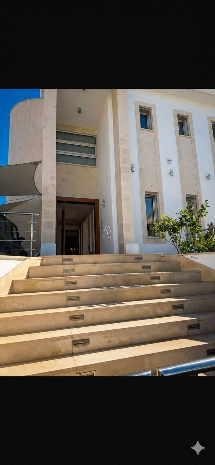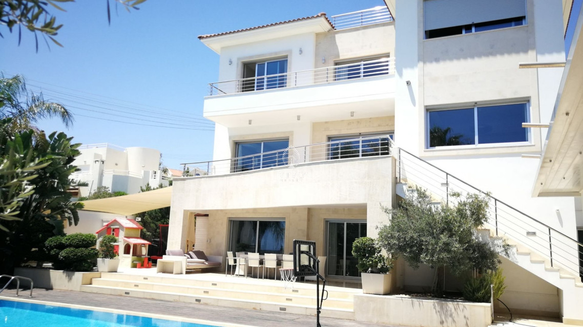 A spectacular luxurious five bedroom villa situated in a quiet neighborhood on the privileged hills of Agios Tychonas with panoramic sea views from all floors. Just three minutes distance from the seafront, all amenities and famous 5* Hotels. The villa stands on a plot of 856m2 and has covered areas of approx. 490m2 on three levels. The villa was built by the owners with high quality materials giving attention to every detail. Outside there is a big beautiful mature garden with palm trees and grass a private overflow swimming pool of 65m2 with jacuzzi surrounded by a deck, outside shower, huge verandas, BBQ area, garden lights and lots of parking space with electric gates. Entering the house from it's large Irocco wood door, we have a nice hall with closet space, large spacious living area with nice atmosphere ceiling spot lights, spacious separate fully equipped German kitchen (Siematic, Gaggenau and Miele) with island bar, Corian surfaces and extra kitchenette, elegant dining room and large front and back veranda. On the top floor we have the three very big bedrooms all en-suite with Jacuzzi, Italian wardrobes and veranda with breathtaking views. On the lower level we have an extra very bright identical sitting and kitchen area as the ground floor, with another two bedrooms, laundry room, small gym and access to the garden/pool/barbecue area. Automatic security system, alarm & cameras, central A/C system and underfloor heating are just some of the extras. A must see villa with ready title deeds.