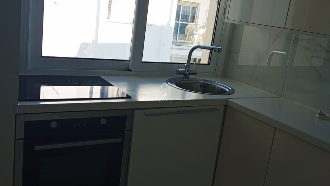 Situated on the **4th floor** of a residential building, the apartment features an **open-plan living and dining area** that opens onto a **covered balcony with beautiful sea views**. The **fully equipped kitchen** provides everything you need for comfortable daily living.