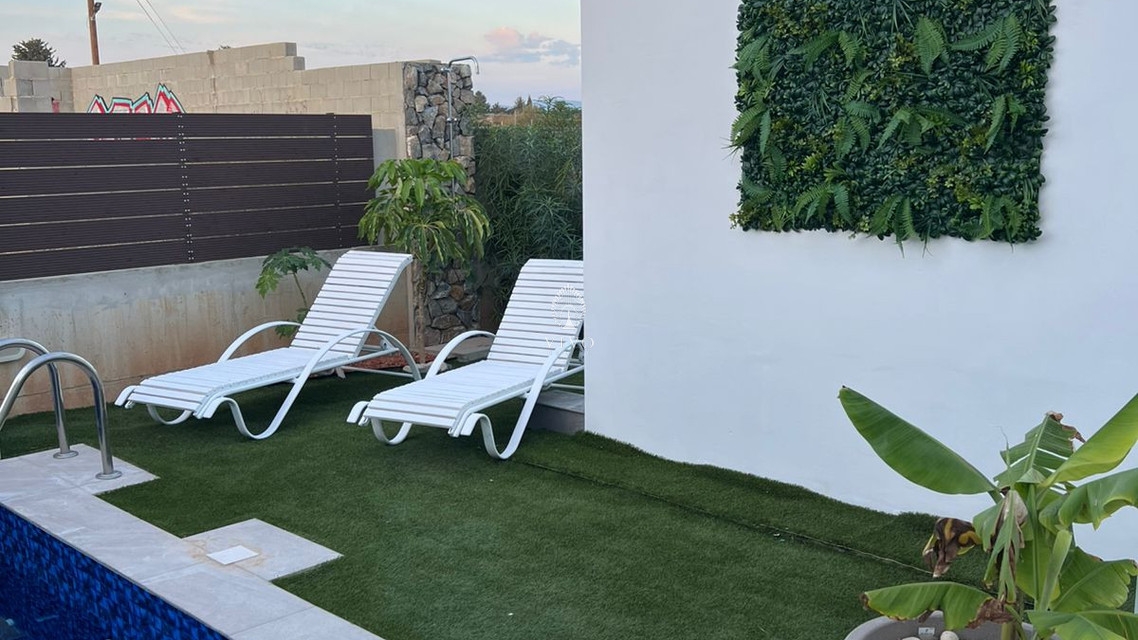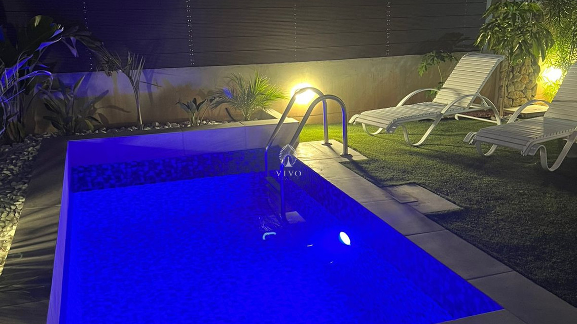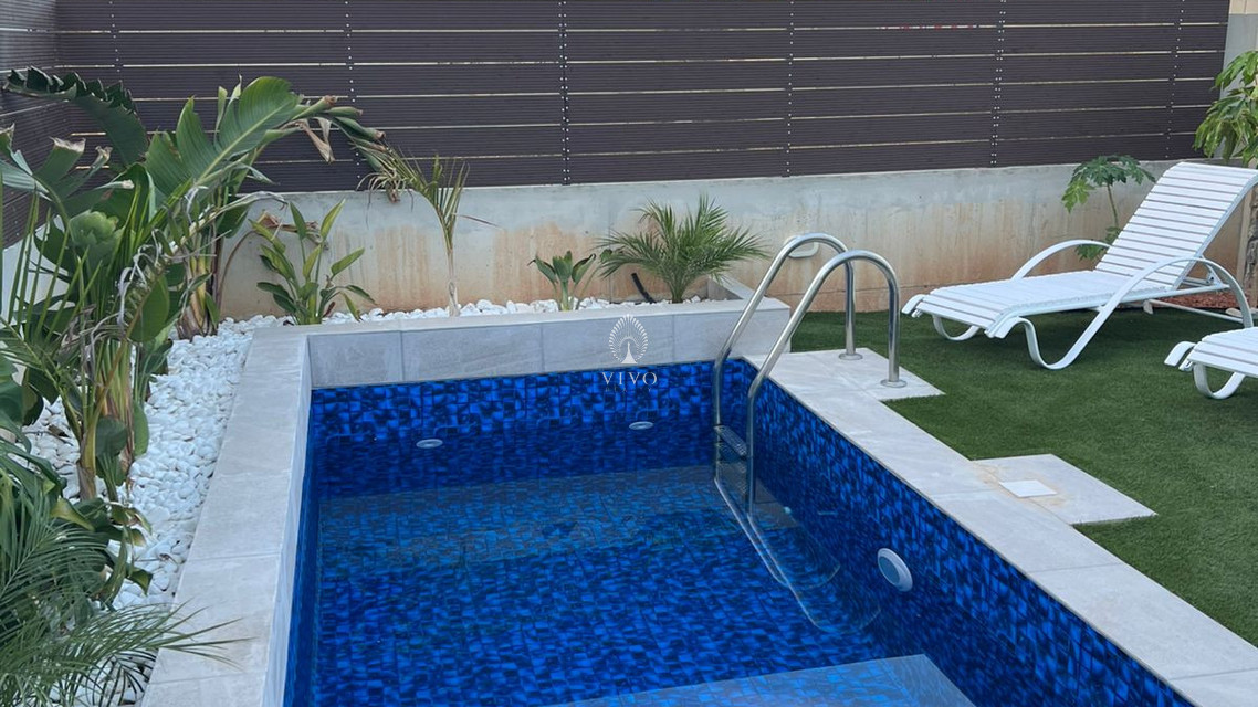The property is situated on a 300 sq.m. plot and features a landscaped garden and a private swimming pool powered by solar panels, resulting in no electricity cost for pool operation.