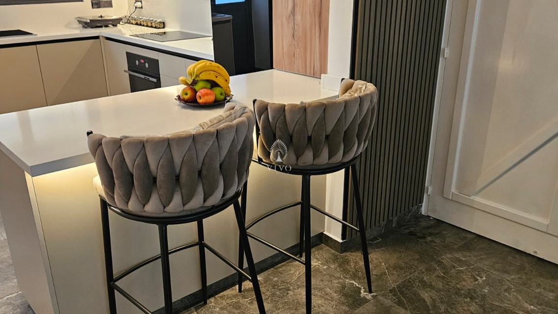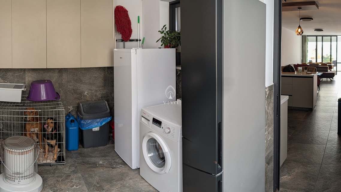 The modern, fully equipped kitchen offers practicality and contemporary design, with direct access to an additional versatile room. Currently used as a laundry area, this space can easily be converted into a home office or storage room, depending on your needs.