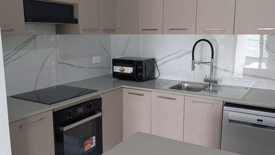 Situated on the 1st floor of a contemporary residential building, the apartment features an open-plan living and dining area with access to a covered front veranda enjoying city and sea views. The property includes a fully equipped open-plan kitchen, two comfortable bedrooms (one with en-suite bathroom), and a family bathroom.