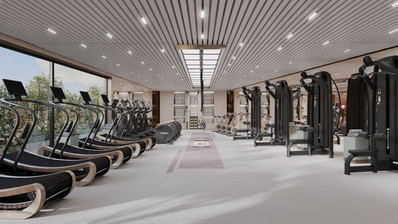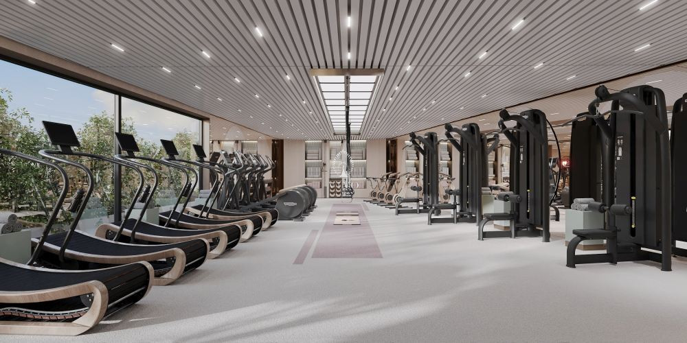 Indoor fitness and wellness center (300 m²), fully equipped for cardio, strength training, and fly yoga.