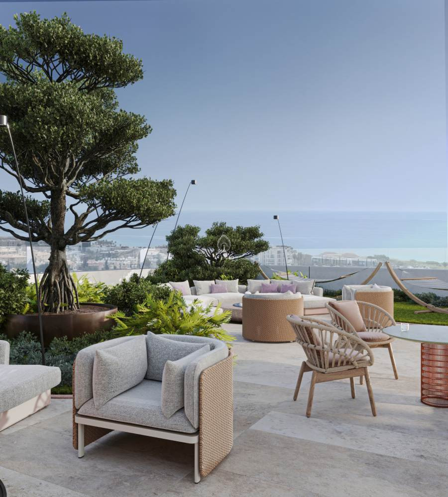 Rooftop terrace with a stylish lounge and barbecue area, offering panoramic sea views.