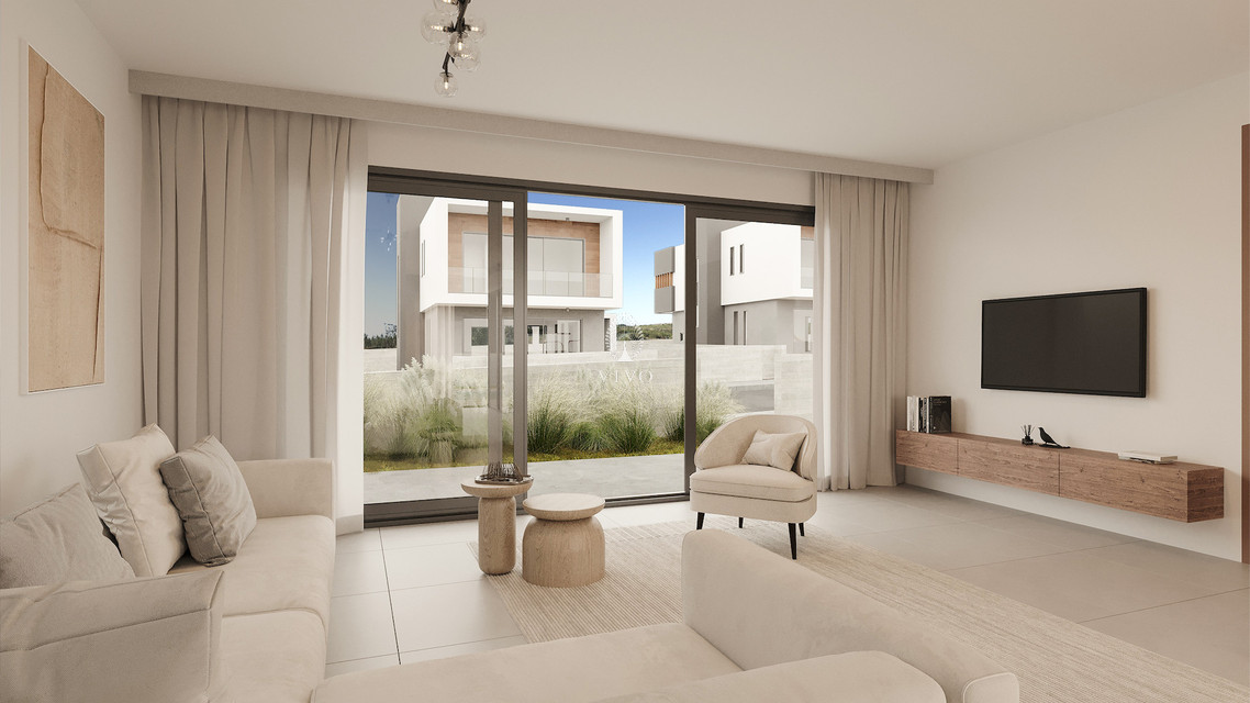 Inside, you will find three spacious bedrooms and two stylish bathrooms. The open-plan layout brings together the living, dining, and kitchen areas, creating a welcoming and practical space for daily life or entertaining guests. Large windows fill the home with natural light while offering pleasant views of the private garden and swimming pool.