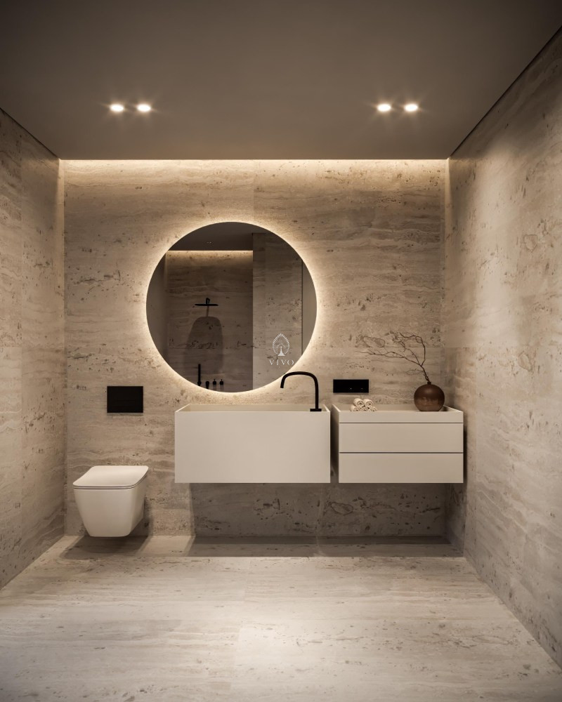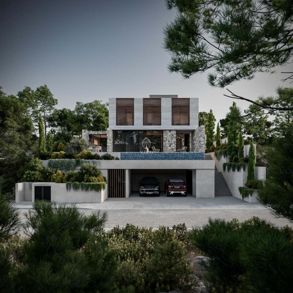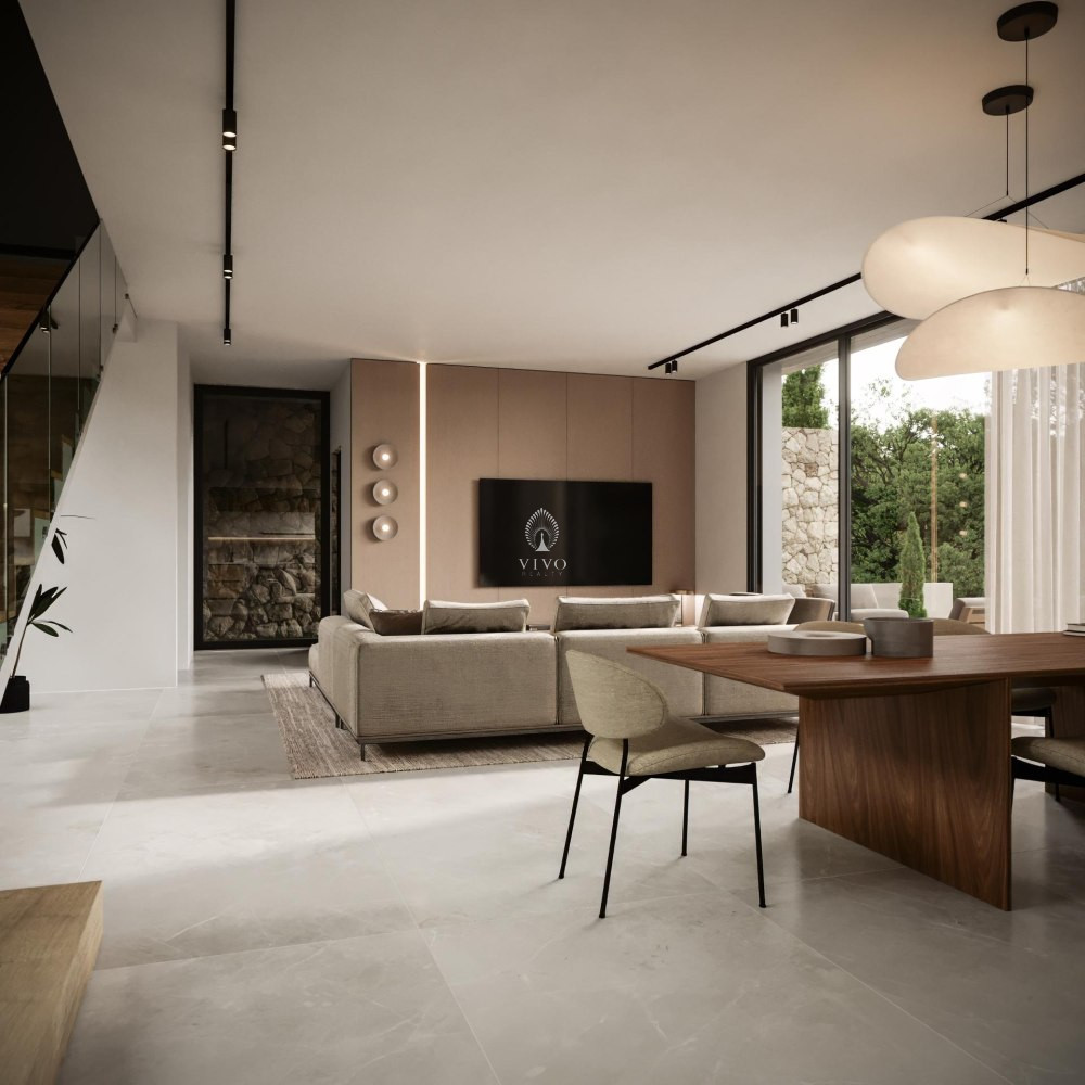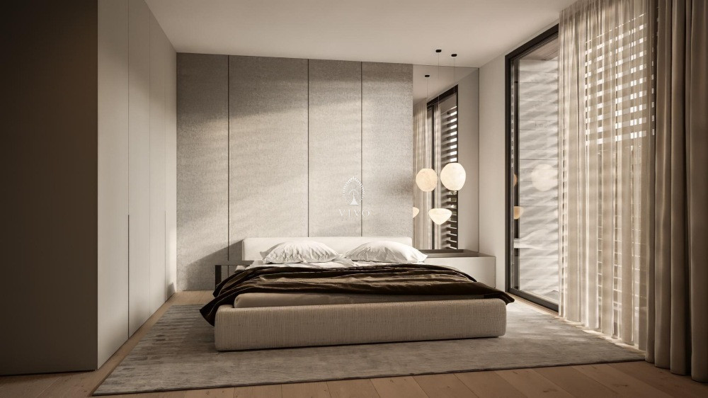 It features four spacious bedrooms, three bathrooms, and an additional guest toilet. Built with high-quality materials, the villa showcases elegance through fair-faced concrete, stone walls, and wood cladding, creating a captivating aesthetic and a unique character.